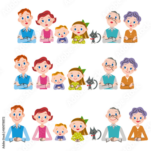 三世代家族が上半身で顔で色々な表情をしているイラスト