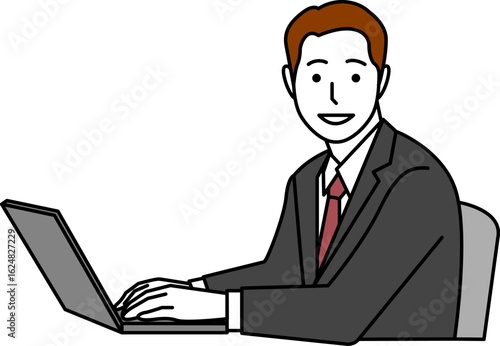 メガネ無し、グレースーツ、顔が正面向きの横から見たパソコンを操作する男性