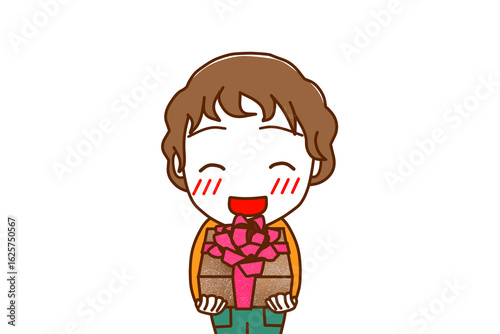 (上半身正面)お祝いの花束を笑顔で渡そうとする白人少年