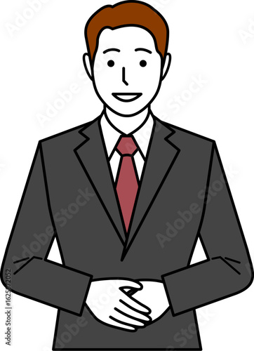 メガネ無し、グレースーツ、正面を向き、両手を前で重ねて話す男性
