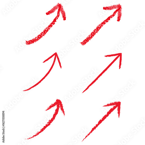 手描きの赤い矢印セット。チョークやパステル、ペンキ風の素朴なザラザラ感のかすれ。クラフトやナチュラルのイメージ。ベクター。
