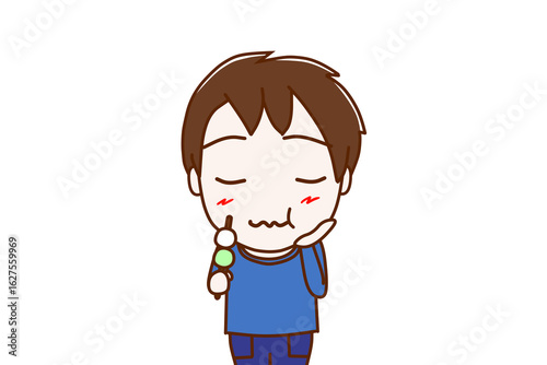 (上半身正面)三色団子を美味しく堪能し味わう少年