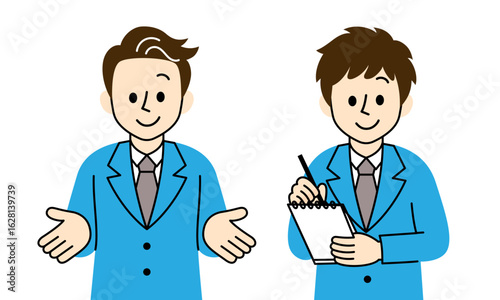 説明する男性とメモを取る男性のビジネスパーソンイラスト(研修_質問_セミナー)