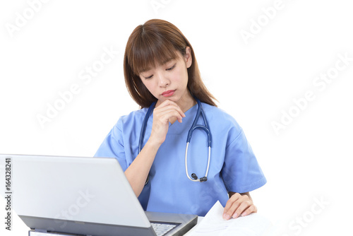 考え事をする女医