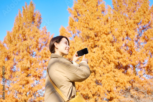 紅葉の写真を撮影する女性 ミドルエイジ