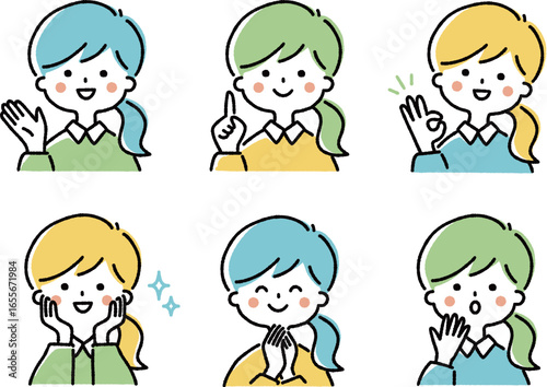 若い女性の表情とポーズセット