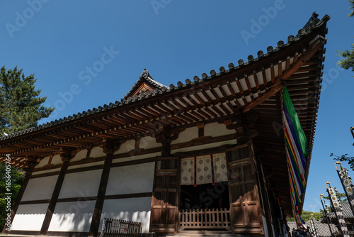奈良、唐招提寺、佛寺、寺院、瓦當、文化財、木造建築、古代建築、日本文化、歷史名勝、文化財、木、綠色、青空、写真素材