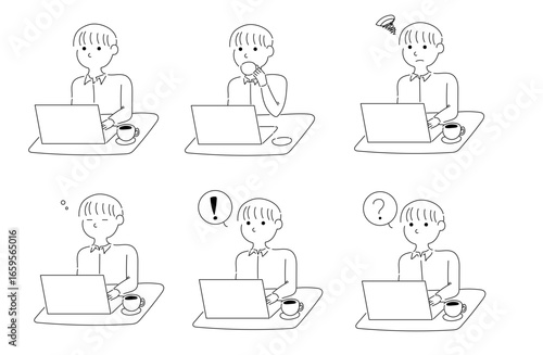 パソコン作業中の男性の様々な表情とリアクションセット
