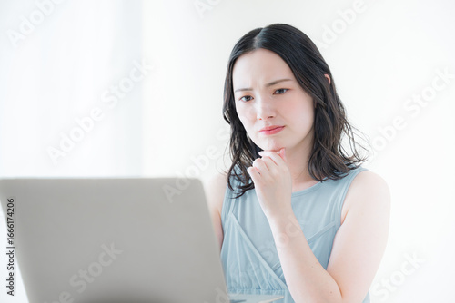 パソコンの前のかわいい女性 情報が正しいか困る悩む考える難しいネガティブな表情 春夏のノースリーブ