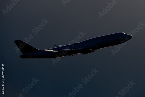 美しい空・雲を背景に飛ぶ航空機