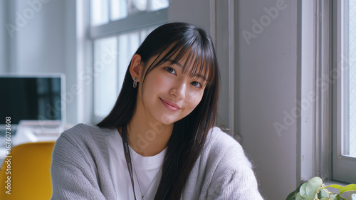 女性が室内で明るく笑顔で学習支援に参加する姿