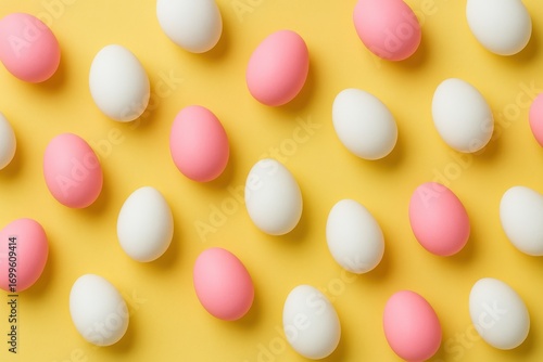 黄色い背景に並べられたピンクと白いイースターエッグのパターン