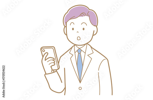 スマートフォンを見る紫髪で白衣の男性のイラスト