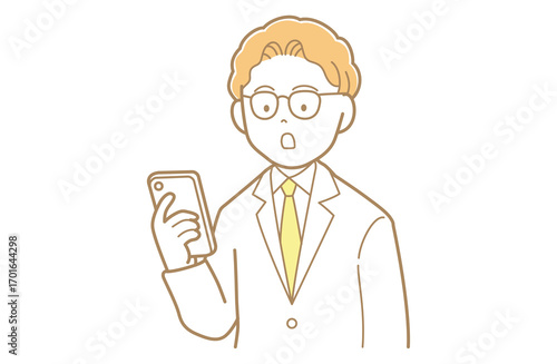 スマートフォンを見る金髪で白衣の男性のイラスト