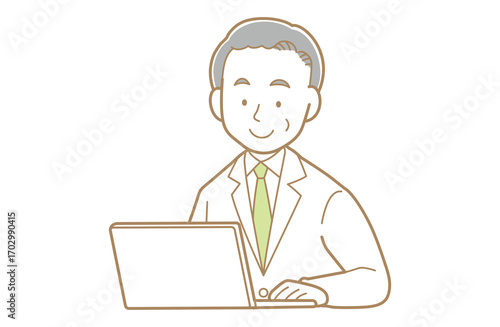 パソコンを使うグレイヘアで白衣の男性のイラスト