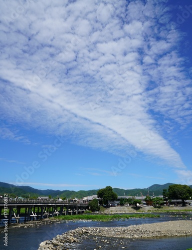 京都の嵐山 保津川(桂川)に架かる渡月橋と河原の風景