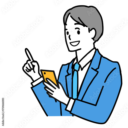 スマホを持ちポイントを説明する若いビジネスマン のイラスト