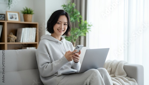 自宅でくつろぐパーカー姿のショートヘアの女性