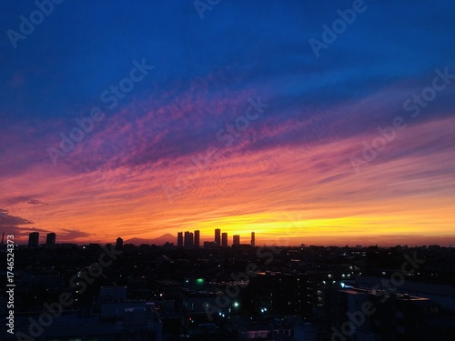 色のコントラストが鮮やかな夕焼け 高層ビルと富士山