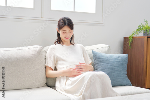 ソファーに座ってお腹を触る妊婦