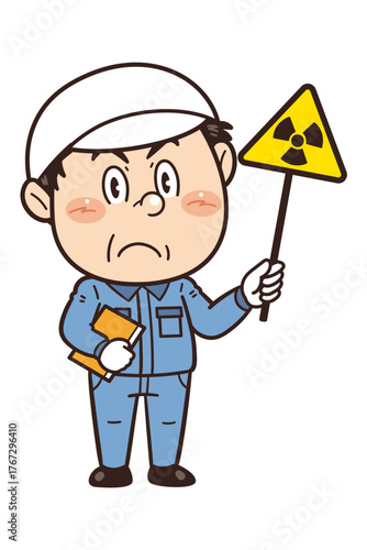 【放射線注意】工場や現場で働く男性作業員が警告標識を持つイラスト|不安全行動・不安全状態・労働災害