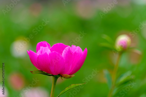 初夏の庭に咲く鮮やかなピンクのシャクヤクの花