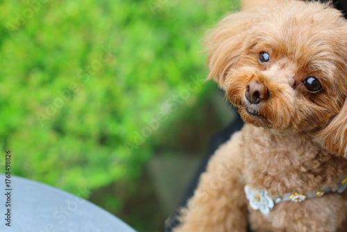 ドッグカフェのテーブルで空を見上げるトイ・プードル