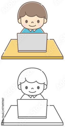 デスクでノートパソコンを操作している男の子のイラスト素材
