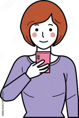 正面向き。スマホを見るカットソーの若い女性。