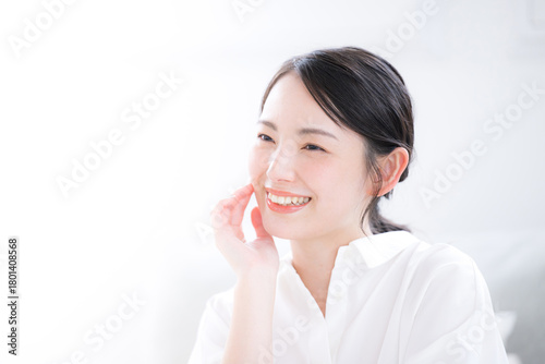 白シャツで清潔感あふれる若い女性の笑顔とスキンケア・美肌のビューティーポートレートのクローズアップ