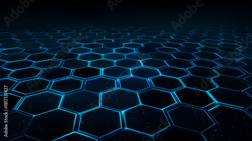 青い六角形が広がる未来的なネットワーク背景デザイン