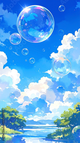 公園の青空に浮かぶシャボン玉の水彩画風イラスト