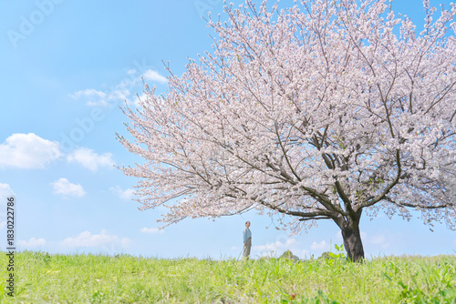 満開の桜を見る女性