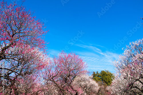 紅白の梅が美しく咲き誇る梅園 青空背景
