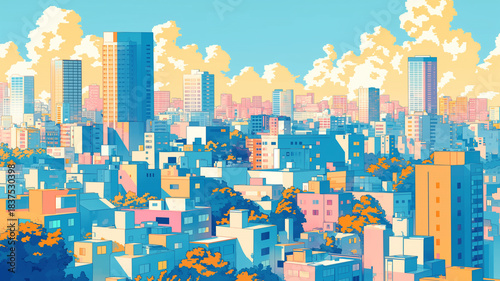 都会の夕暮れ、ピンクとブルーで彩られた高層ビルと空が描く幻想的風景、レトロ感漂うおしゃれな都市風景イラスト、昭和レトロ、シティポップ、ノスタルジー、ビル群、クリアスカイ