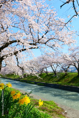 春の四重奏で知られる、舟川べり桜並木。朝日、富山、日本。4月上旬。