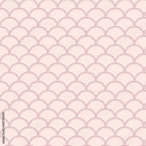 ハートのスカラップ模様のシームレスパターン(ピンク)ー 淡いピンクのハートを連ねたスカラップ柄。デザインペーパー、マスキングテープ、マスキングシールブック、フレークシール、手帳デコ素材、ノート表紙、ハンカチ、箸、マグカップ、皿、キッチンクロス、キッチン雑貨、ポーチ等に最適。バレンタインにも。
