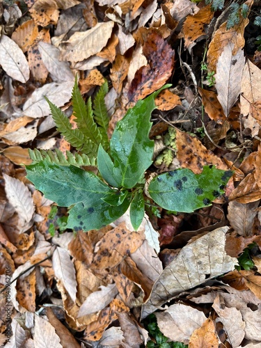 冬の林床で多く見かける、青々とした葉をもつアオキ。落