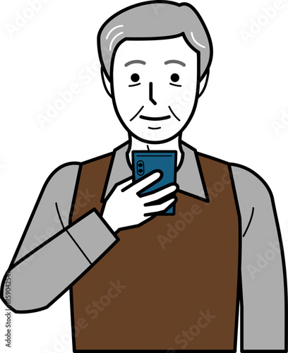 正面向き。スマホを見るシャツとベストを着た高齢男性。