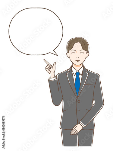 正面をむいて指をさし微笑むスーツの男性 吹き出し付き
