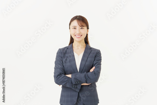 白背景の腕組みをするカメラ目線のスーツを着た若い日本人女性のポートレート