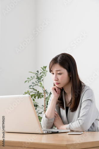 ノートパソコンと女性、資料作り、苦戦、飽きる