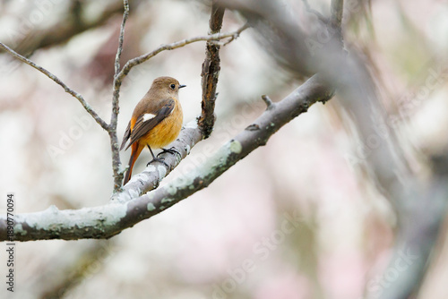 梅の木にとまる愛嬌のあるジョウビタキ