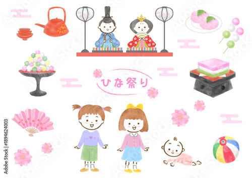 ひな祭り素材と女の子のイラストセット