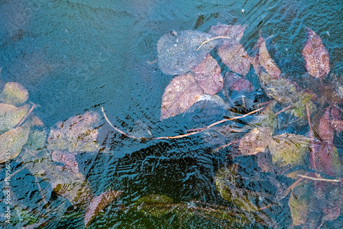 枯葉の沈む凍った池