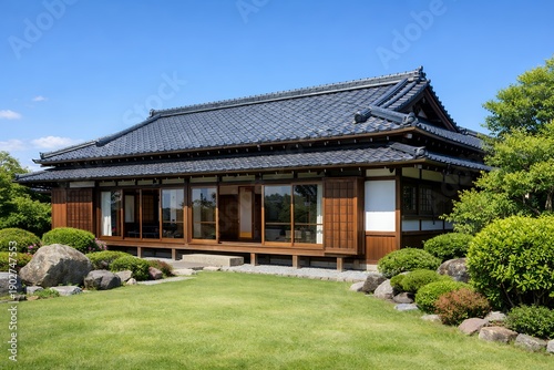 青空の下で手入れされた庭に佇む日本の伝統的な平屋和風住宅の落ち着いた風景