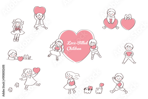 ピンクのハートと子供や動物の可愛い手書きイラストセット|優しさと幸せを表現