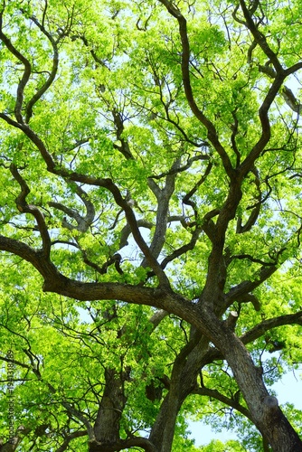 初夏の新緑の楠と青空
