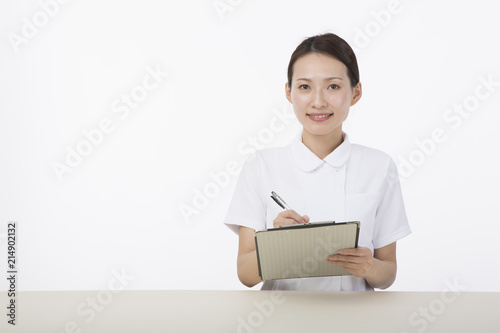 カルテとペンを持って微笑む白衣を着た女性
