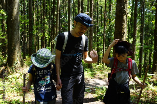 山歩きを楽しむ親子 家族 兄弟 ハイキング